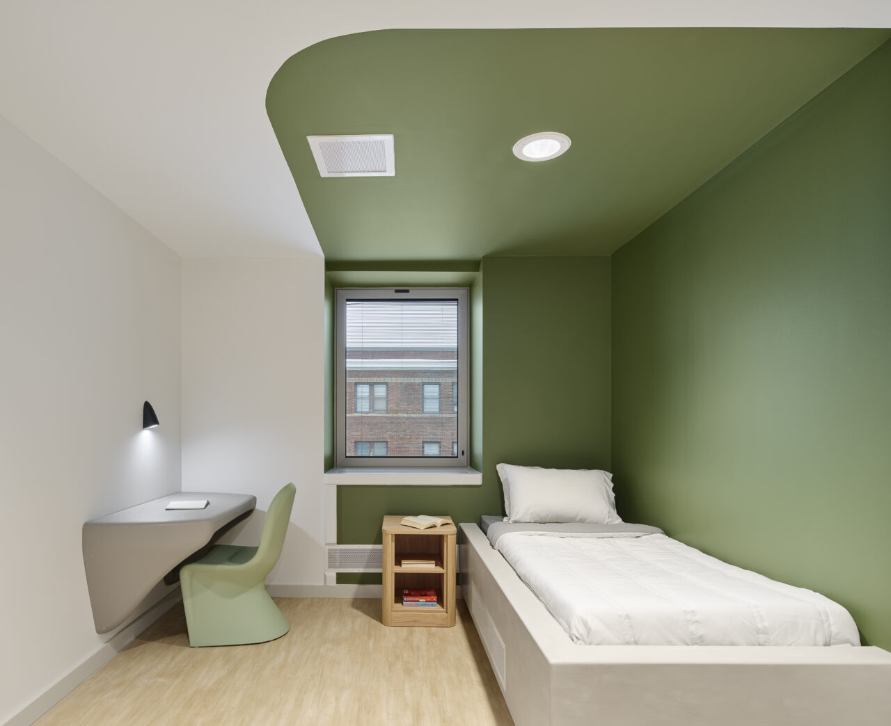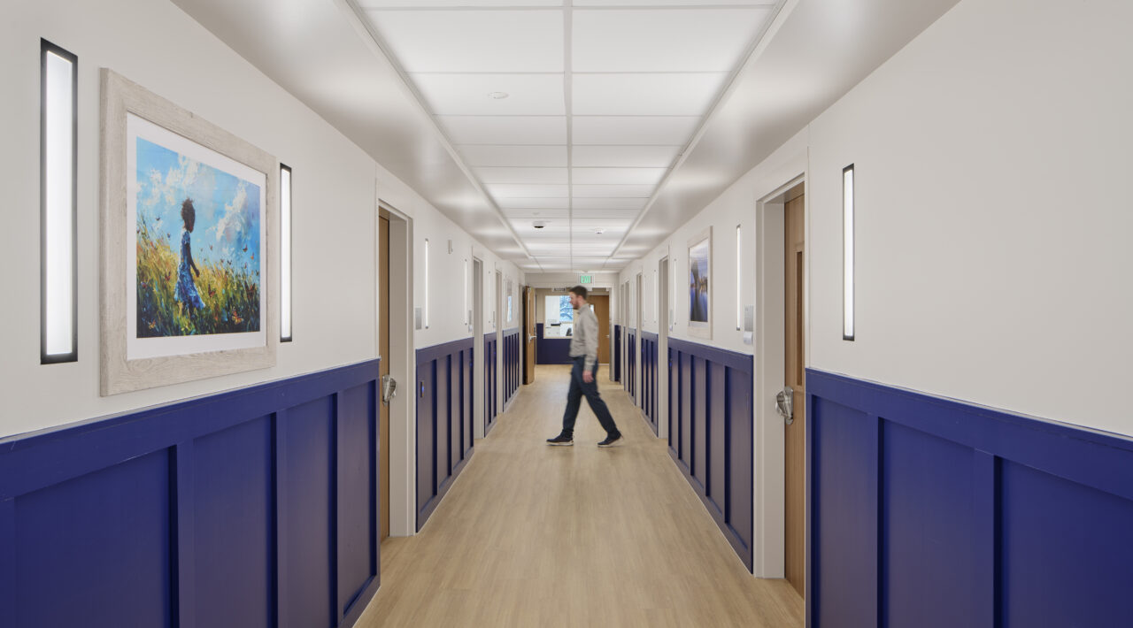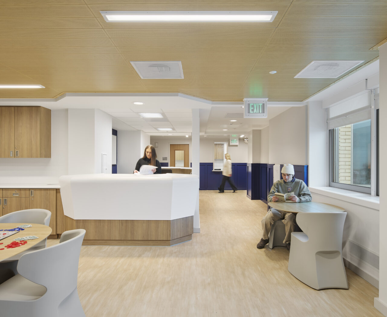 The Hennepin County Youth Stabilization Center includes a 13-bed Crisis Stabilization unit and 5-bed Withdrawal Management unit serving youth ages 8-17 with complex behavioral health needs in and around Minneapolis, Minnesota. The 13-bed Crisis Stabilization Unit is divided into two independent neighborhoods that have access to family resources, classroom education, and therapy consultation. An especially impactful feature of the project is dedicated access to a safe, outdoor space with an adjacent indoor activity room for those cold winter months. The project included the partial renovation of three floors of a hospital building originally constructed in 1910. Multiple tenants in the building created complex planning solutions to solve safety, privacy, and life safety concerns. Thoughtful use of warm wood tones and residential details creates an environment that feels welcoming and familiar.
