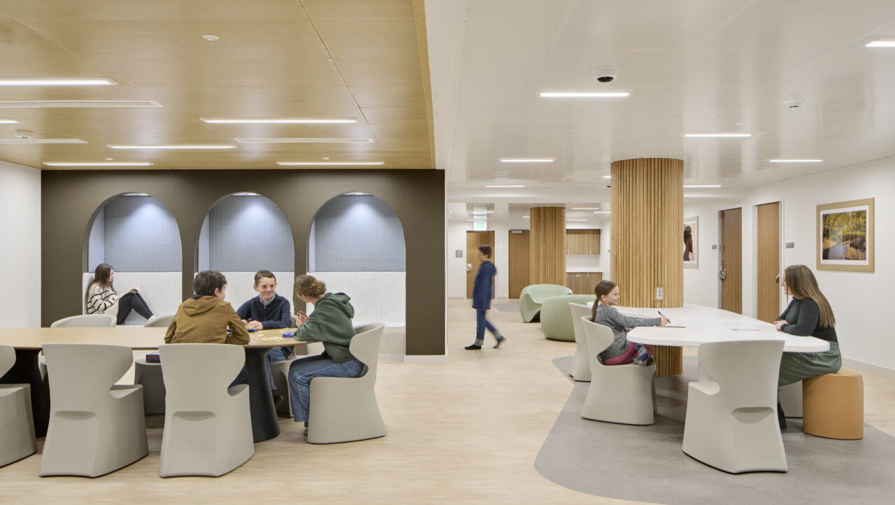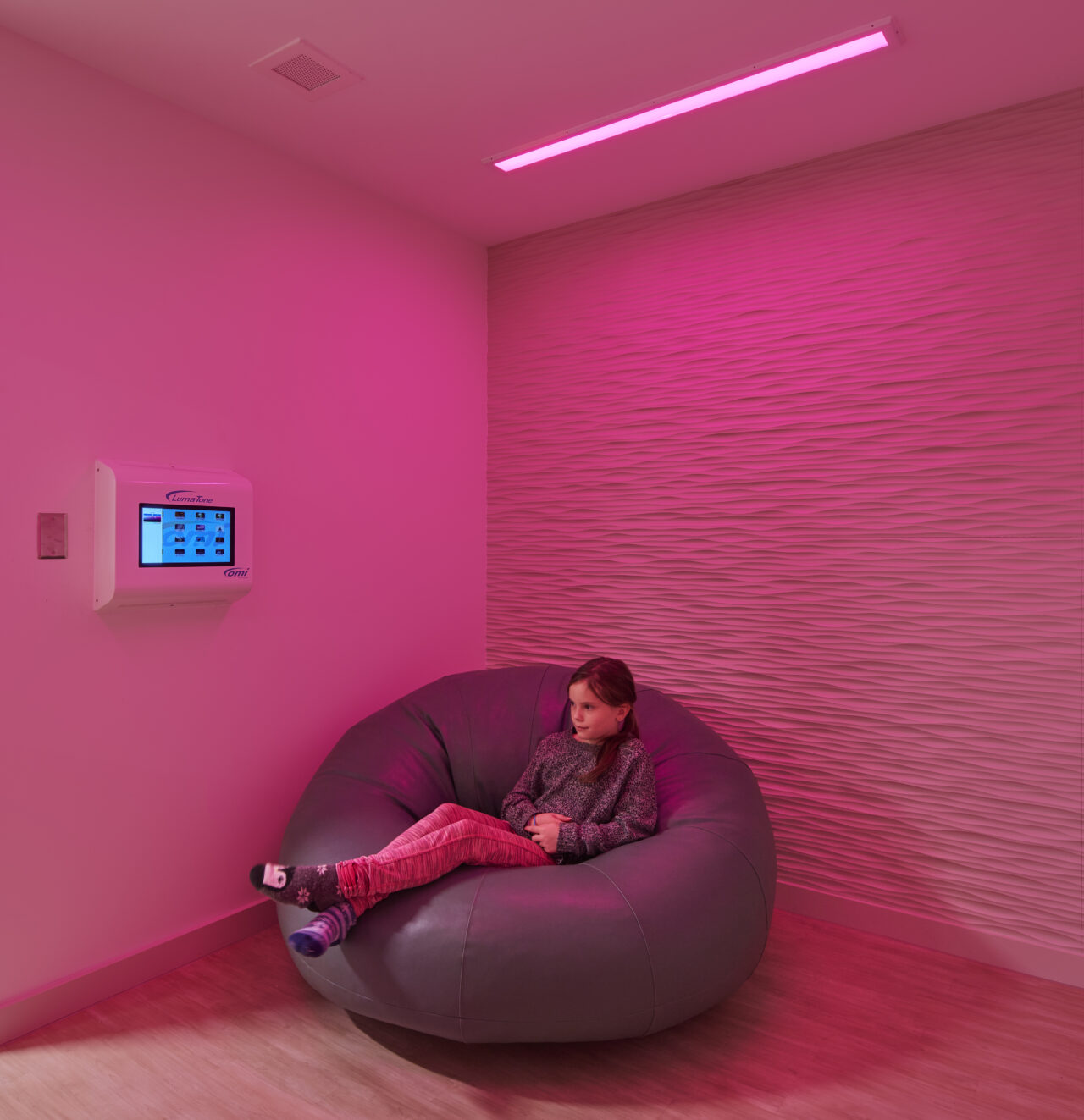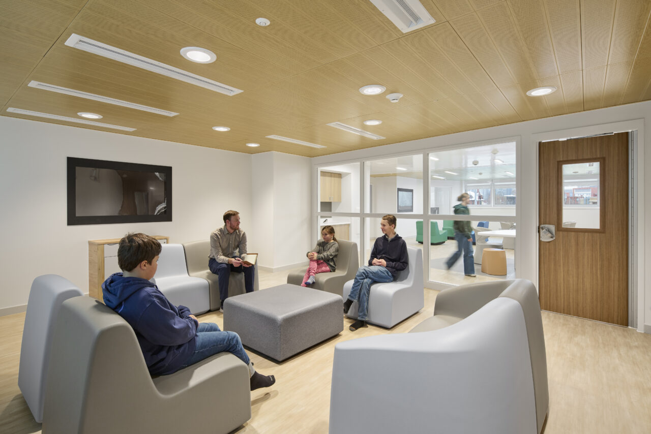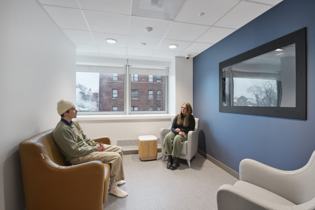 The Hennepin County Youth Stabilization Center includes a 13-bed Crisis Stabilization unit and 5-bed Withdrawal Management unit serving youth ages 8-17 with complex behavioral health needs in and around Minneapolis, Minnesota. The 13-bed Crisis Stabilization Unit is divided into two independent neighborhoods that have access to family resources, classroom education, and therapy consultation. An especially impactful feature of the project is dedicated access to a safe, outdoor space with an adjacent indoor activity room for those cold winter months. The project included the partial renovation of three floors of a hospital building originally constructed in 1910. Multiple tenants in the building created complex planning solutions to solve safety, privacy, and life safety concerns. Thoughtful use of warm wood tones and residential details creates an environment that feels welcoming and familiar.